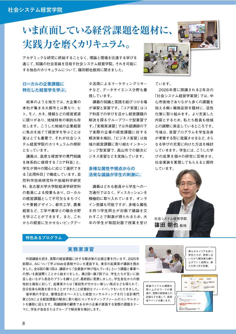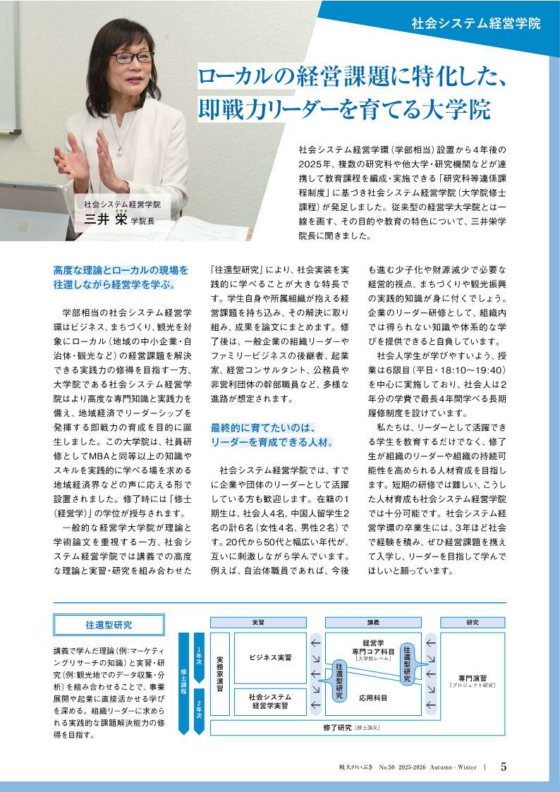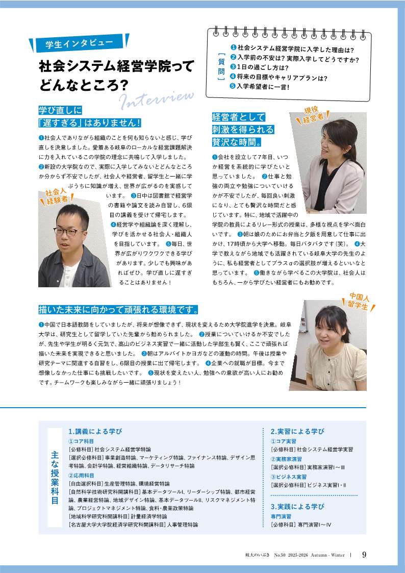 2025.12.16 おしらせ 「岐大のいぶき50号【2025年12月発行】」に社会システム経営学院の特集が掲載されました 岐大のいぶき50号に社会システム経営学院の教育の特色等の詳細が掲載されました。 学生インタビューも含めわかりやすくまとめられているので、ぜひご覧ください。 岐大のいぶき50号【社会システム経営学院 抜粋】 岐大のいぶき50号:ibuki50.pdf 企業・他機関の方修了生の方受験を考えている方在学生の方市民の方教職員の方