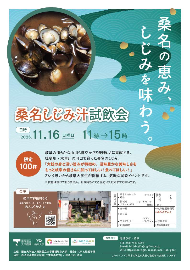 11月16日(日)岐阜市神田町・あんどかふぇにて、桑名産シジミ汁の試飲会を開催します。