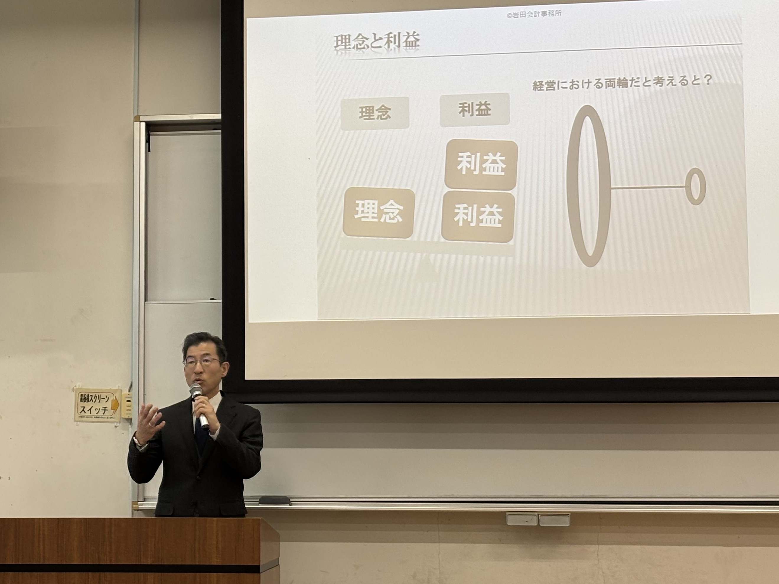 2026年1月22日(木)の「会計学」の講義(1年次後学期授業、担当教員:篠田朝也教授)において、社会システム経営学環と包括連携協定を結んでいる岩田会計事務所の岩田英人税理士をお招きして、ご講演いただきました。
